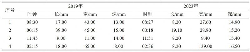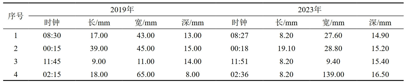 為了分析不同內檢測商對缺陷尺寸的量化差異,本文選取了4處能夠匹配的缺陷進(jìn)行了數據對比(表 3)。分析可知,兩次內檢測匹配缺陷時(shí)鐘方位之間的差異均較小。由于檢測器閾值及量化模型差異的原因,缺陷長(cháng)度、寬度及深度均存在一定差異,單純通過(guò)缺陷列表數據并不能確定缺陷實(shí)際增長(cháng)情況。在數據對比時(shí),可以通過(guò)列表觀(guān)察缺陷變化的趨勢,并針對有較大變化的缺陷進(jìn)一步分析,提高比對效率。