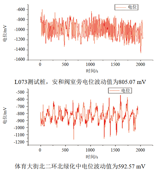 (3)雜散電流干擾檢測。地鐵開(kāi)通前檢測,2017年,鑒于當時(shí)石家莊市區地鐵2號線(xiàn)即將開(kāi)通,監管部門(mén)要求對市區地段管線(xiàn)進(jìn)行雜散電流干擾全面評估,必要時(shí)安裝排流裝置。根據GB 19285―2014《埋地鋼質(zhì)管道腐蝕防護工程檢驗》第4.3.4條,采用電位波動(dòng)法檢測9處雜散電流波動(dòng)情況,7處雜散電流干擾等級為強,部分結果如圖 1所示。