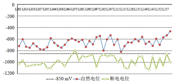 圖 2 全線(xiàn)管道測試樁處管道斷電電位及自然電位分布圖