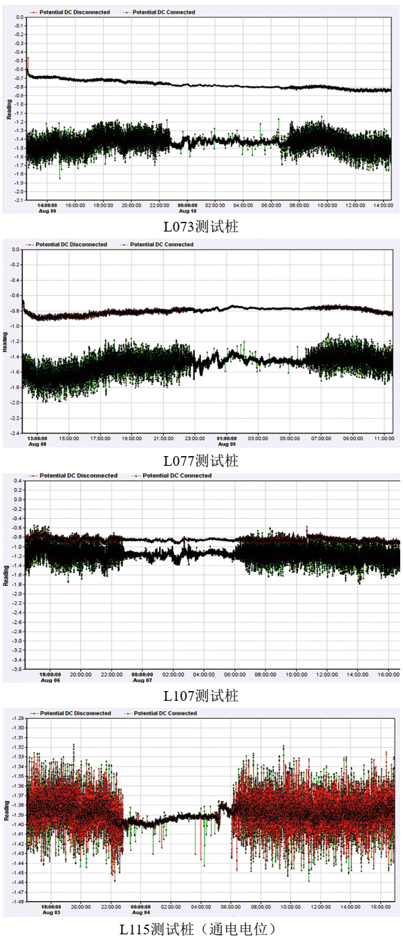 L073、L077和L115樁的斷電電位基本不受直流干擾影響,L107樁斷電電位在﹣800 mV左右波動(dòng),這是因為檢測期間自身陰保不合格所致。2020年電位專(zhuān)項測試過(guò)程中,因陰保站恒電位儀運行異常,部分測試樁斷電電位無(wú)法滿(mǎn)足陰保準則要求,經(jīng)增大恒電位儀輸出,并配合犧牲陽(yáng)極保護,之后監測斷電電位一直負于﹣850 mV,滿(mǎn)足陰極保護要求。