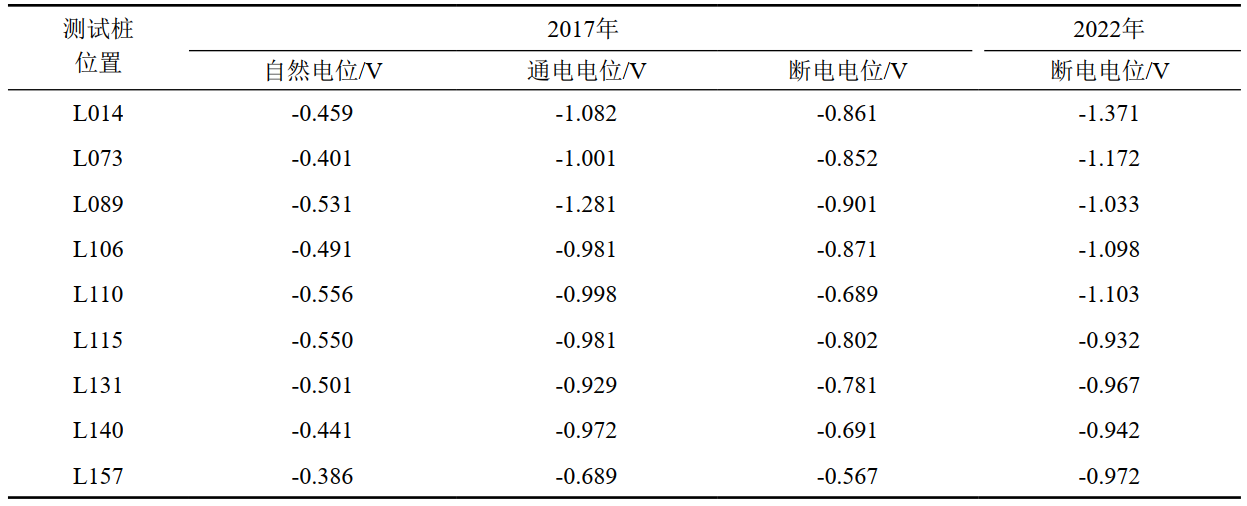 (2)土壤電阻率檢測。根據GB/T 19285―2014《埋地鋼質(zhì)管道腐蝕防護工程檢驗》,2017年共檢測9處土壤電阻率,其中2處土壤腐蝕性等級為中(44.6Ω.m和22.7Ω.m) ;7處為弱(83.3 Ω.m ~166.1 Ω.m),土壤腐蝕性總體為弱。2022年檢測結果與此差異不大。