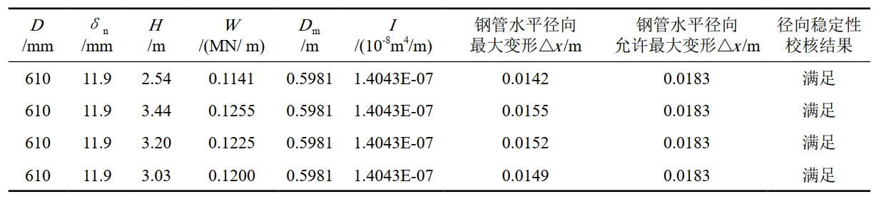 由計算結果可以得出,直埋于體育大街下的4處管頂埋深分別為2.54 m、3.44 m、3.20 m、3.03 m,體育大街公路通行車(chē)輛的單軸最大動(dòng)載荷為25 t(三軸),滿(mǎn)足徑向穩定性校核要求。