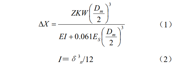 其中,W=γ×D×H+行駛車(chē)輛動(dòng)載荷;Δx 為鋼管水平方向最大變形量,m;D為鋼管外徑,610 mm;Dm為鋼管平均直徑,m;Z為管變形滯后系數,取1.5;K為基床系數,0.103;E為鋼材彈性模量,N/m2;I為單位管壁截面慣性矩,2.08×10-8m4/m;δn為鋼管公稱(chēng)壁厚,m;Es為土壤變形模量,2.8 N/m2;W為作用在單位管長(cháng)上的總豎向載荷,N/m(參考JTG D60―2015《公路橋涵設計通用規范》);γ為土壤容重,MN/m3,取0.017;H為管頂回填土高度,m。