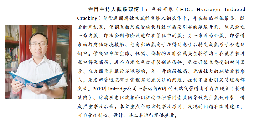 美國國家運輸安全委員會(huì )(NTSB,National Transportation Safety Board)調查顯示,管道斷裂位置存在硬點(diǎn)(制造缺陷),因氫致開(kāi)裂導致管內天然氣大量泄漏,與空氣混合形成爆炸性混合物發(fā)生燃燒爆炸,是事故發(fā)生的直接原因。管道硬點(diǎn)缺陷、防腐層老化破損和陰極過(guò)保護等因素共同為氫致開(kāi)裂創(chuàng )造了條件。同時(shí),Enbridge公司未按照行業(yè)推薦指南對硬點(diǎn)缺陷進(jìn)行評估和管理,對2014年啟動(dòng)的反輸風(fēng)險認識不足,增加了管道外部腐蝕和氫氣析出,低估了各因素交互影響風(fēng)險。