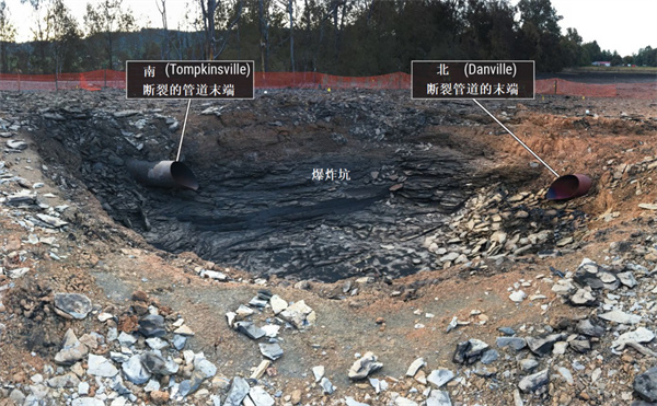2019年8月1日,Enbridge公司一條管徑762 mm(30英寸)、壁厚9.5 mm天然氣管道在美國肯塔基州丹維爾附近發(fā)生破裂爆炸事故。事故造成1人死亡、6人受傷、75人疏散,泄漏天然氣約297萬(wàn)立方米。一段10.12 m(33.2英尺)長(cháng)的管子被拋在距爆炸點(diǎn)西南約146.6 m(481英尺)處。引起的大火燒毀附近5棟房屋,另有14棟受損(最遠距離335.28 m/1100英尺);一條鐵路遭火災破壞。事故現場(chǎng)形成一個(gè)長(cháng)16.76 m(55英尺)、寬10.67 m(35英尺)、深3.66 m(12英尺)的爆炸坑。如圖 1、圖 2、圖 3所示。