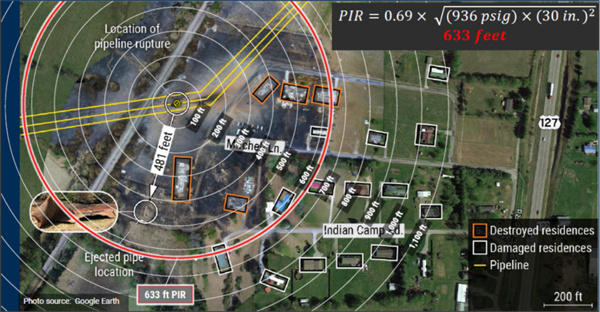 (1)潛在影響半徑計算公式對事故危害后果估計不足。按現有公式計算,事故管道潛在影響半徑(PIR)為192.9 m(633英尺),現場(chǎng)唯一死亡人員位于管道破裂位置以南195 m(640英尺)處,受損房屋距離破裂位置最遠為335 m(1100英尺),事故現場(chǎng)危害后果半徑大于計算值。NTSB分析,其主要原因為潛在影響半徑計算模型基于以下假設,包括破裂后受限氣流的流量方程和流量系數,假設泄漏速率為破裂發(fā)生一段時(shí)間后而不是泄漏峰值時(shí)速率;假設氣體溫度為15℃(59°F)而斷裂時(shí)的管道內溫度要高得多;熱輻射閾值強度取15.8 kw/m2(5000 Btu/hr/ft2)并不是完全不受影響的范圍;假設火焰方向為垂直向上而事故現場(chǎng)火焰主要朝向為東,在該方向熱影響區更大。如圖 5所示。