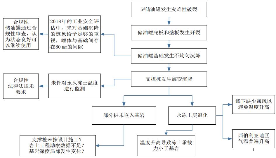 俄羅斯聯(lián)邦環(huán)境、工業(yè)和核監管局開(kāi)展了事故調查,同時(shí)涉事企業(yè)委托伊爾姆環(huán)境資源管理咨詢(xún)公司(Environmental Resources Management,ERM)開(kāi)展了獨立事故原因分析。調查顯示,儲油罐發(fā)生破裂是由多種因素共同作用的結果,直接原因是受氣候變暖等因素的影響,凍土退化造成儲油罐混凝土支撐樁性能劣化受損,儲油罐基礎發(fā)生不均勻沉降,導致罐底與罐壁開(kāi)裂(圖 2)。儲油罐事故原因分析如圖 3所示。