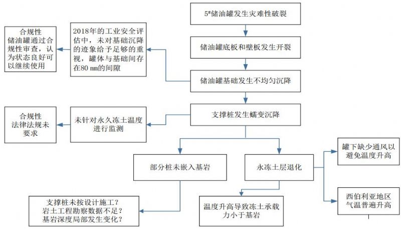 (2)安全管理存在不足。事故調查表明,涉事企業(yè)安全管理和安全保障水平與其儲油量水平不相匹配,對儲油罐隱患排查結果及異常跡象、儲油罐處于核心作業(yè)區的邊緣、針對油罐區的二級和三級防控措施的重要性未給予足夠重視。事發(fā)前的2018年,監管機構曾進(jìn)行儲油罐安全隱患檢查,涉事企業(yè)認為該儲油罐的管理整體符合相關(guān)監管要求,但其對潛在風(fēng)險以及管理不足缺乏足夠認識。如安全檢查中缺乏對儲油罐基礎的關(guān)注,未能評估支撐樁實(shí)際狀態(tài)是否符合設計文件和相關(guān)法規要求;對檢測到的儲油罐垂直度偏差、基礎與罐底之間存在80 mm的間隙等沉降指標未給予足夠重視。氣候變化導致凍土退化的風(fēng)險未列入日常檢查并采取措施,缺乏對永凍土層必要的監控(法規對此沒(méi)有強制要求)等。