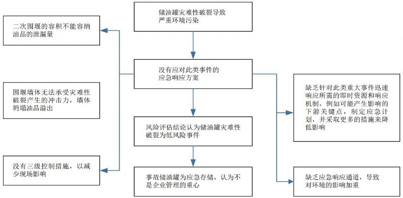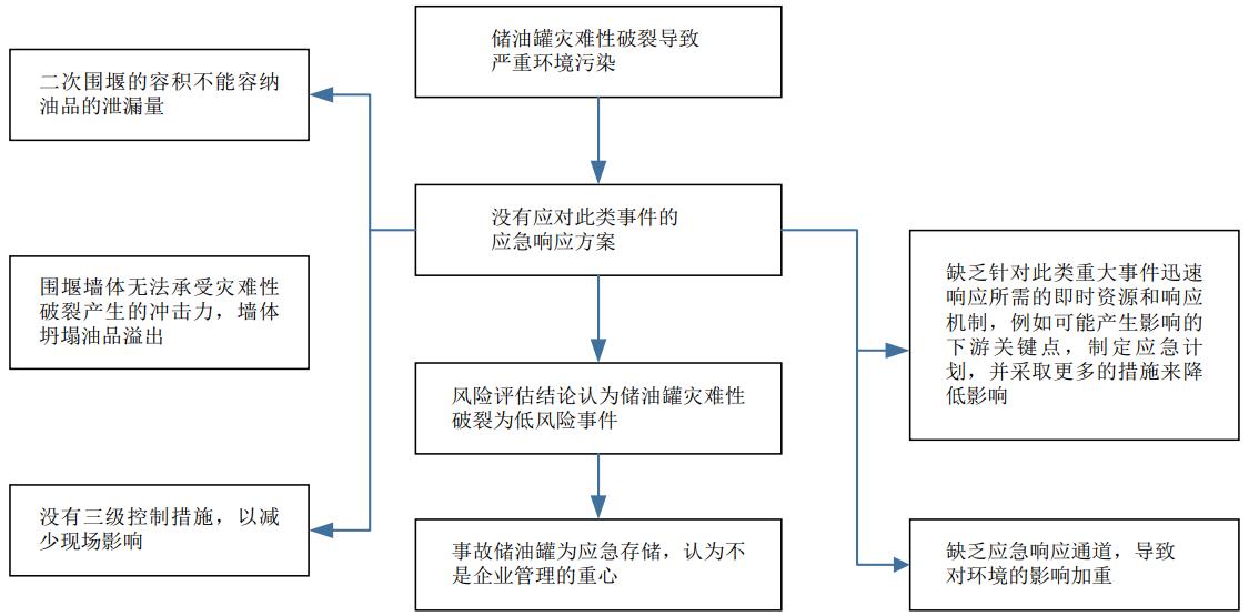 (3)應急處置工作不到位;诤弦幮运季S而不是基于對風(fēng)險的理解開(kāi)展安全管理,儲油罐發(fā)生開(kāi)裂失效風(fēng)險的可能性和嚴重性被低估。以往風(fēng)險評估認為災難性破裂事故發(fā)生概率很低(1.5×10-5),后果也很。▋H考慮了對土壤的影響),失效情況不太嚴重,風(fēng)險評估報告也未對此提出建議措施。應對重大泄漏事件的措施和經(jīng)驗不足,缺乏對此類(lèi)重大事件迅速響應所需的資源和響應程序,未進(jìn)行詳細的溢油模擬以制定溢油反應計劃(OSRP)。OSRP對受影響區域的估計甚至比風(fēng)險評估中計算的區域還要小。儲油罐圍堰容積不足以容納泄漏的油品,圍堰墻體未能承受住泄漏油品的動(dòng)態(tài)沖擊發(fā)生坍塌,油品溢出圍堰。對溢油可能的流向估計不足,未制定和實(shí)施有效的溢油應急預案。風(fēng)險消減措施也僅限于清除污染土壤和從圍堰內回收油品。如圖 5所示。