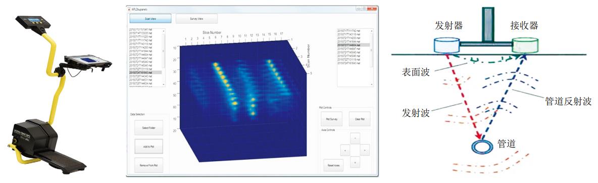 該方法多用于地下管線(xiàn)較少時(shí)的管道輔助探測,適用于全部淺埋金屬和非金屬管道,市政公用管道應用較多。典型設備如美國杰恩公司APL聲學(xué)管線(xiàn)定位儀(圖 3)。其工作模式類(lèi)似于探地雷達,通過(guò)發(fā)射器向地面發(fā)射探測聲波(探地雷達是發(fā)射電磁波),接收器接收探測聲波的反射波,完成一次“斷面探測”,通過(guò)多次斷面探測記錄的反射波的強度、速度和持續時(shí)間等計算出地下管道的位置、管徑等信息。