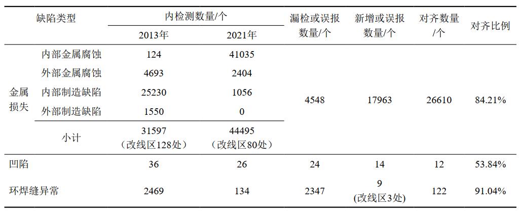 表 2 兩次內檢測缺陷對齊結果