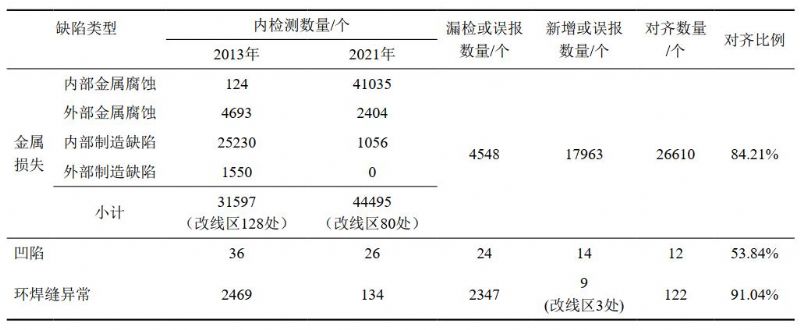 基于LCS算法,對于管道特征對齊,兩次內檢測數據對齊可實(shí)現閥門(mén)、三通、法蘭對齊比例100%,管道環(huán)焊縫對齊比例99%以上。對于管道缺陷,因內檢測器識別能力、檢測精度差異,受管道運營(yíng)條件變化導致的缺陷增長(cháng)以及管道改線(xiàn)換管等因素的影響,管道缺陷對齊比例較特征對齊比例有所下降,但金屬損失類(lèi)缺陷的對齊比例仍可達到80%以上。