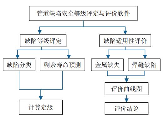 沈陽(yáng)檢測技術(shù)分公司自行研發(fā)的管道缺陷安全等級評定與評價(jià)軟件V1.0集成了缺陷定級和評價(jià)兩大功能。依據TSG D7005―2018對金屬損失、焊縫缺陷等進(jìn)行分類(lèi),根據缺陷類(lèi)型輸入各缺陷相關(guān)參數,可快速計算給出評級結果,以確定管道缺陷等級。依據SY/T 6477―2017 《含缺陷油氣管道剩余強度評價(jià)方法》,針對缺陷形式選擇推薦的缺陷評價(jià)方法,如管體腐蝕、表面金屬損失等缺陷,選擇體積型缺陷評價(jià)方法;焊縫裂紋、咬邊等缺陷,選擇裂紋型缺陷評價(jià)方法等。針對等級超標的缺陷,給出適用性評價(jià)的結論和建議。利用該軟件,能夠極大地提高缺陷評級的準確性和評價(jià)效率,為處置缺陷給出明確理論依據。軟件結構框架與模塊功能如圖 1所示。