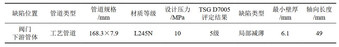 某輸氣站場(chǎng)開(kāi)展全面檢驗時(shí)發(fā)現站內工藝管道某閥門(mén)下游管體存在局部減薄,管道及缺陷基本信息如表 1所示。