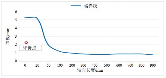 (2)合于使用評價(jià)。上述管體缺陷按照局部腐蝕評價(jià)。將管體缺陷相關(guān)參數輸入軟件中即可得出評價(jià)曲線(xiàn)圖(圖 4),根據坐標圖中的評價(jià)點(diǎn)位于臨界曲線(xiàn)圖下方,可以直觀(guān)得出結論為缺陷可接受。本次管體缺陷合于使用評價(jià)結果為可接受,無(wú)需立即修復,建議按照檢測周期監控運行。