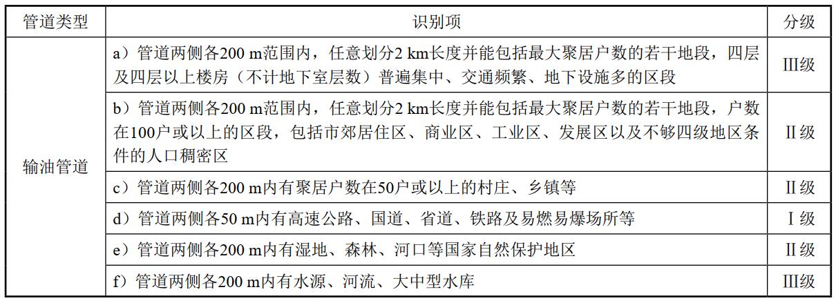 表 1 輸油管道高后果區管段識別分級表