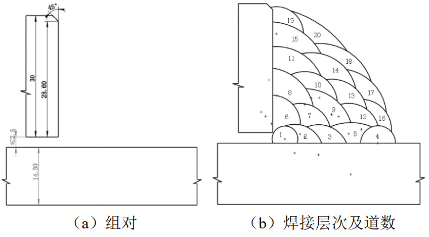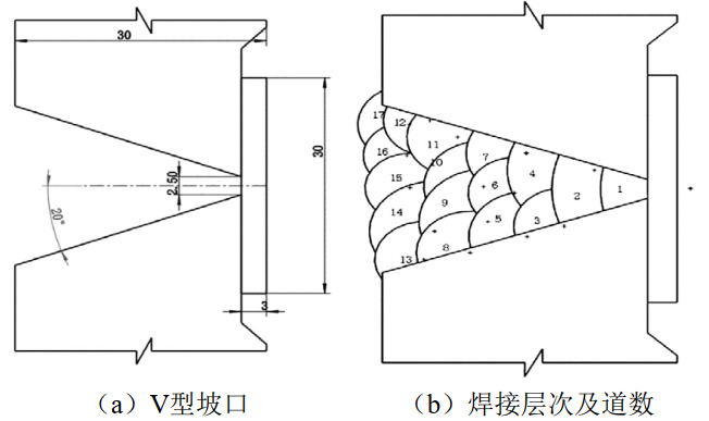 (3)墊層及回火焊道。按圖圖 3(b)標注1至4焊道焊接墊層,3道和4道之間焊接回火焊道,如圖 3(b)所示第5焊道。