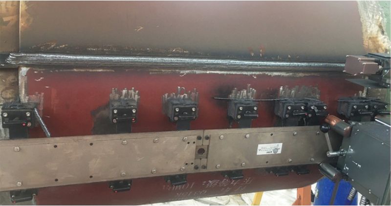(2)條形缺陷。原因:焊槍的角度不合適,層間出現夾溝時(shí)未及時(shí)打磨平整,焊接電流過(guò)小。解決辦法:焊接每一道時(shí),調整好焊槍角度,熔寬搭接上一道焊縫的1/2左右,在焊接環(huán)角焊縫10點(diǎn)至2點(diǎn)鐘位置時(shí),容易出現較深的夾溝,應適當調節小車(chē)行走速度,減小擺寬,適當增加焊接電流。