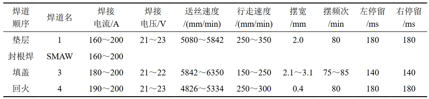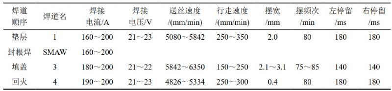(5)回火焊道。在蓋面焊時(shí),在最后一道焊縫處采用回火焊道工藝,焊后打磨距母材1 mm厚,且平整,如圖 3(b)所示第20焊道。