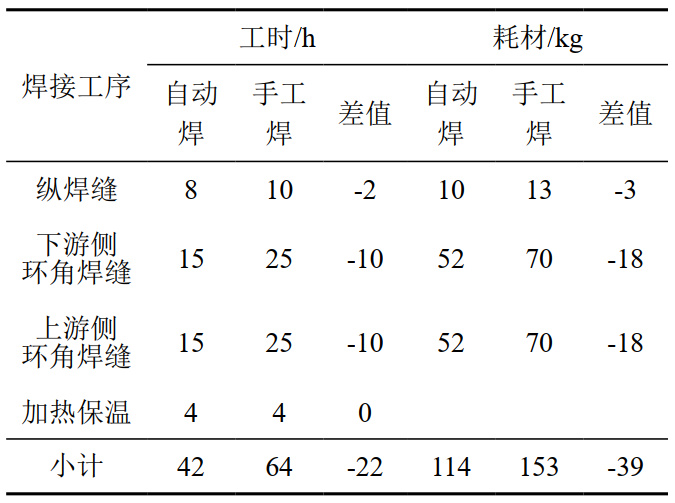 從表 3可以看出,不考慮軌道安裝、小車(chē)調整、管口組對等用時(shí)及差異,與人工焊接相比,自動(dòng)焊純焊接用時(shí)縮短34%;采用藥芯焊絲,比人工使用焊條節省耗材25%。焊工可由4人減至2人,其優(yōu)越性突出。
