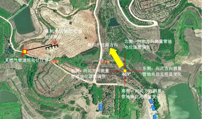 (3)確認干擾源。對西北方向丘陵西側進(jìn)行排查,在道路旁發(fā)現一處密封小房屋,經(jīng)墻上電話(huà)聯(lián)系確認為某燃氣管道強制電流陰極保護站,輔助陽(yáng)極地床位于該小房屋東南側農田中,與初步判斷的雜散電流干擾源方向相符。經(jīng)聯(lián)系該燃氣企業(yè)停用陰極保護恒電位儀后,測試469#管地電位恢復正常;啟用該恒電位儀后,重新處于干擾狀態(tài)。反復啟停恒電位儀測試確認,該處強制電流陰極保護系統陽(yáng)極地床為原油管道469#測試樁靜態(tài)直流雜散電流干擾源。如圖 2所示。