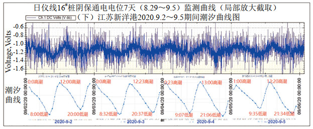 在日儀線(xiàn)16#樁、62#樁位置各設置1臺DL-1靜態(tài)數據記錄儀對管道管地電位進(jìn)行長(cháng)周期監測,采集頻率為1次/30 s。發(fā)現2處監測點(diǎn)的管地電位正偏移波峰、負偏移波谷時(shí)間節點(diǎn)與江蘇新洋港附近海域潮汐高潮、低潮時(shí)間節點(diǎn)吻合,規律一致,呈現24 h周期內“兩峰—兩谷”特征,且相鄰2次管地電位正向(漲潮)或負向(低潮)偏移時(shí)間間隔均為12 h,兩處監測點(diǎn)管道管地電位波動(dòng)情況一致,均為典型的潮汐地磁干擾特征(圖 5)。
