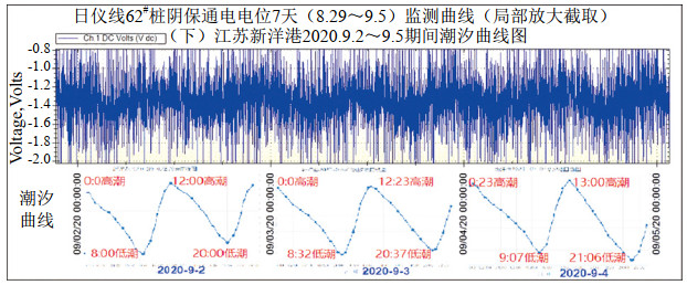 圖 5 日儀線(xiàn)管地電位監測曲線(xiàn)與對應時(shí)間段附近海域潮汐曲線(xiàn)對比圖