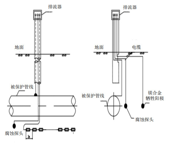 (2)在干擾嚴重、陰極保護不達標管段,采取負接地極(一般采用鎂合金犧牲陽(yáng)極)+極性排流器組合方式進(jìn)行排流防護(圖 6)。