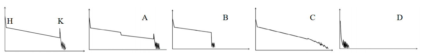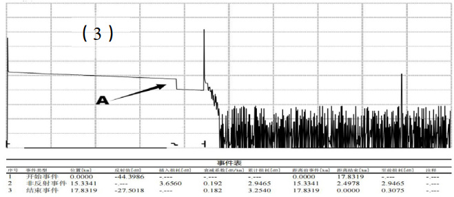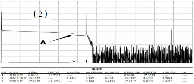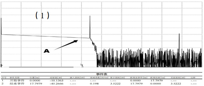 光時(shí)域反射儀接收到的反射激光信號隨光纜長(cháng)度增加而逐漸減弱直至消失,檢測波形整體呈逐漸下降狀態(tài),H處為檢測盲區,K處為反射峰,說(shuō)明光纜末端已制成端口。如圖 2(左)所示。