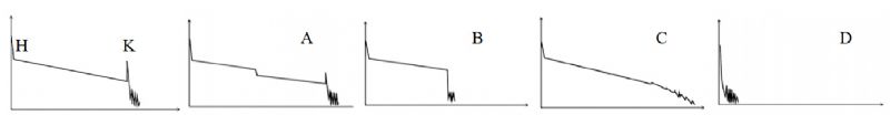 圖 2 光時(shí)域反射儀檢測正常波形(左)和四種異常典型波形