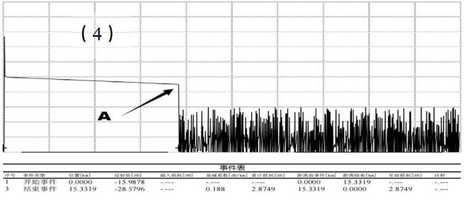 某長(cháng)輸成品油管道沿線(xiàn)多為農田及丘陵,同溝敷設光纜約300公里,其中輸油末站與相鄰光纜中繼站共敷設17.8公里光纜,采用2芯主用,2芯熱備用,剩余4芯冷備用的配置方式。某次月度檢測發(fā)現,該段光纜存在損耗點(diǎn)且有隨時(shí)間推移損耗逐漸增大趨勢(圖 3)。1號波形為該段光纜正常檢測結果,2號波形A點(diǎn)處出現損耗臺階并隨時(shí)間推移形成3號波形A點(diǎn)損耗臺階,在制定光纜維修方案期間形成4號波形A點(diǎn)處光纜中斷點(diǎn),并導致該熱備用芯無(wú)法正常投用。