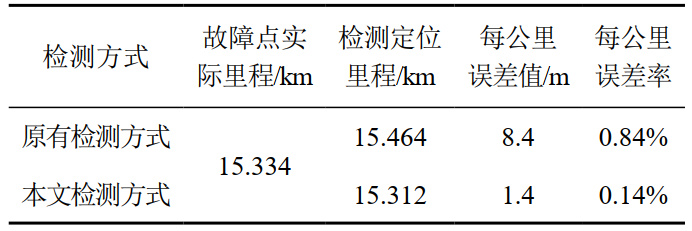 通過(guò)使用上述四種方法,本次檢測定位將光纜故障點(diǎn)每公里誤差率從8.4%降至1.4%,極大程度提高了故障點(diǎn)的定位精度(表 1)。