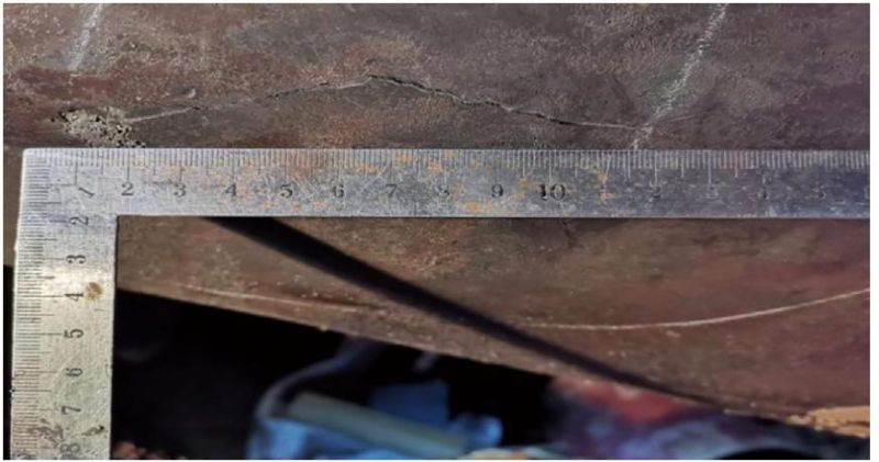 接報后,衛輝站和新鄉處先后啟動(dòng)站應急預案和處應急預警,并于17時(shí)36分采取停輸措施。隨后應急人員攜帶挖掘設備到達現場(chǎng)。管道泄壓后,搶修人員現場(chǎng)開(kāi)挖長(cháng)8 m、寬3 m、深約3 m作業(yè)坑,未發(fā)現管道泄漏點(diǎn),土壤中僅斷續存在點(diǎn)絮狀油跡。剝離管道防腐層,導通流程利用高程余壓尋找漏點(diǎn),衛輝站出站壓力最高升至0.7 MPa,未查到漏點(diǎn)。隨后中洛線(xiàn)濮陽(yáng)站啟一臺輸油泵繼續排查漏點(diǎn),出站壓力升至2.1 MPa,在管道順油流方向9點(diǎn)鐘位置發(fā)現一處長(cháng)約11 cm母材裂縫(圖 2),有原油滲出。經(jīng)反復排查確認無(wú)其他滲漏點(diǎn)后,中洛線(xiàn)再次停輸,處應急指揮中心研究確定搶修方案,對裂縫處進(jìn)行長(cháng)補板臨時(shí)修復(圖 3)。 補板完畢,確認具備啟輸條件,終止站級預案,解除處級預警。