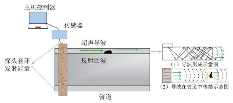 超聲導波是機械波在空間有限的介質(zhì)內多次往復反射并進(jìn)一步產(chǎn)生復雜的疊加干涉以及幾何彌散形成的。其用于長(cháng)輸管道檢測中,常常將傳感器沿外壁均勻布置一周,用陣列形式激勵出一束超聲能量脈沖,并通過(guò)不同的加載方式激勵出不同的導波模態(tài)。超聲能量脈沖充斥著(zhù)管道整個(gè)圓周方向和整個(gè)管壁厚度并向遠處傳播,遇到缺陷時(shí)會(huì )在缺陷處返回一定比例的反射波,探頭陣列接收反射波信號并進(jìn)行波形轉換,進(jìn)而識別和判斷缺陷位置和大小。導波檢測原理如圖所示。