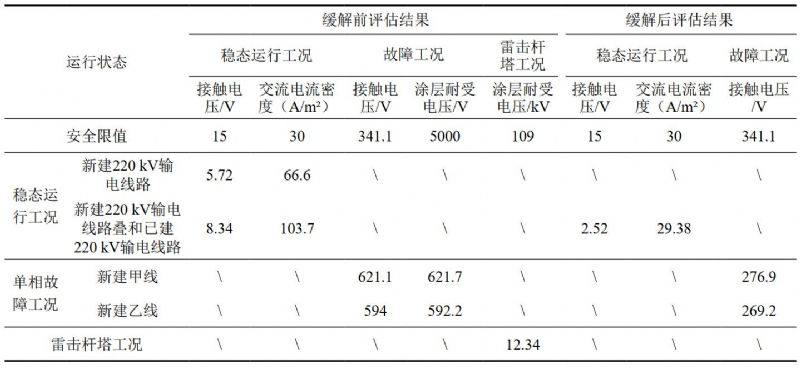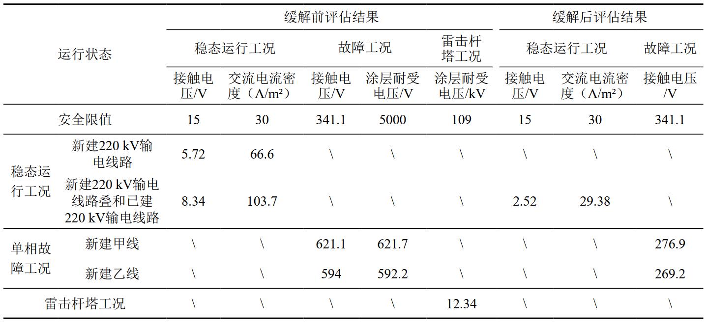 (1)根據上述交流干擾評估流程,本項目評估結果:①基于管道沿線(xiàn)的土壤電阻率測量數據,確定電氣等效兩層土壤模型,表層至0.69 m深處土壤電阻率為79 Ω·m,下層(0.69 m以下)土壤電阻率為19.35 Ω·m;②輸電線(xiàn)路在不同運行工況下對油氣管道的干擾評估結果見(jiàn)表 1。由表 1干擾評估結果可知,在新建輸電線(xiàn)路或同時(shí)考慮已建輸電線(xiàn)路穩態(tài)工況下,流過(guò)1 cm²缺陷破損點(diǎn)的最大交流電流密度數值均超過(guò)安全限值30 A/m²,存在管體腐蝕風(fēng)險,需要采取緩解措施;在新建輸電線(xiàn)路甲線(xiàn)和乙線(xiàn)分別發(fā)生單相對地故障工況下,管道沿線(xiàn)地面可接觸金屬結構物接觸電壓均超過(guò)安全限值341.1 V,存在人身安全風(fēng)險,需采取緩解措施。