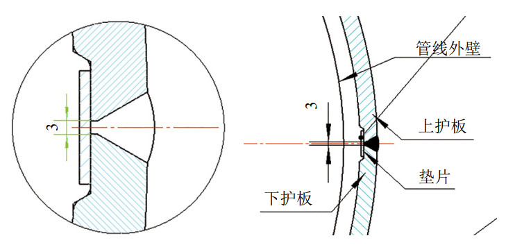 將緊固鏈條組合放置在上護板兩端,并用鏈條兜起下護板,旋轉緊固絲杠使下護板緩慢提升至上、下護板縱向焊縫間隙至3 mm~6 mm。將墊片塞入縱向焊縫墊片槽內并與護板點(diǎn)焊固定(圖 1)。