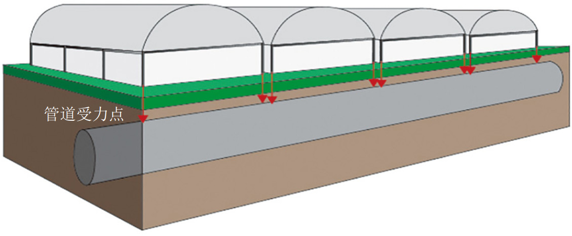 (5)長(cháng)期承壓易造成管道變形。若油氣管道與大棚走向并行,此時(shí)管道受大棚的重力荷載基本為零,但此類(lèi)情況較小,大多數情況管道走向與大棚走向會(huì )出現交叉甚至重疊(圖 1),此時(shí)管道在一定長(cháng)度內會(huì )出現若干個(gè)集中受力點(diǎn)。隨著(zhù)科技的發(fā)展,溫室大棚技術(shù)越來(lái)越智能化,加上了供水系統、溫控系統、輔助照明系統及濕度控制系統等功能,為保證承重結構和防止出現不均勻沉降,基礎采用鋼筋混凝土澆筑或條石砌筑的圈梁,整體的配置和重量也越來(lái)越接近廠(chǎng)房,管道長(cháng)期在大棚基礎傳遞的外部荷載下會(huì )出現局部高應力狀態(tài),產(chǎn)生彎曲和變形,影響內檢測儀器通過(guò),嚴重時(shí)會(huì )發(fā)生火災爆炸等事故。