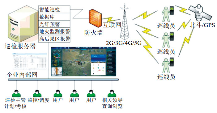 (2)巡檢數據模塊化管理。平臺將巡檢過(guò)程中的關(guān)鍵要素信息,包括巡檢總人數、在線(xiàn)人數、班組及相關(guān)巡檢人員的在線(xiàn)和離線(xiàn)情況,實(shí)時(shí)展示在巡檢地圖中。對于單一巡檢個(gè)體,顯示巡護必經(jīng)點(diǎn)、巡檢軌跡、開(kāi)始時(shí)間、結束時(shí)間、有效巡檢時(shí)長(cháng)、巡檢距離等。如出現巡檢人員的違規行為,系統將實(shí)時(shí)在手機APP終端、巡檢監控中心兩端進(jìn)行報警,自動(dòng)監督糾正。系統每15秒1次實(shí)時(shí)上傳巡檢人員的位置、時(shí)間、軌跡等動(dòng)態(tài)信息繪制在巡檢地圖中,直觀(guān)顯示巡檢的有效性(圖 2)。