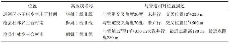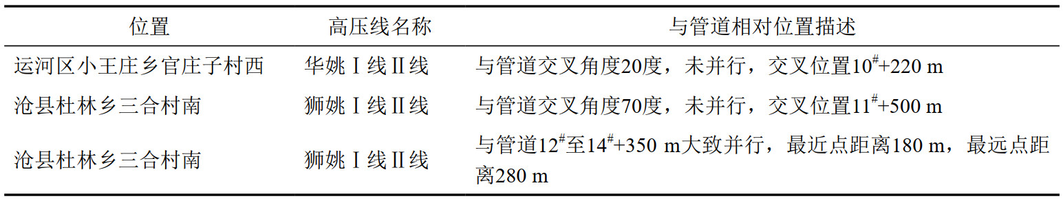 現場(chǎng)踏勘11#和12#附近發(fā)現3條22 kV高壓輸電線(xiàn)路,與管道相對位置見(jiàn)表 1。距管道1.6 km處為滄州華潤發(fā)電廠(chǎng),與管道相對位置見(jiàn)圖 1。