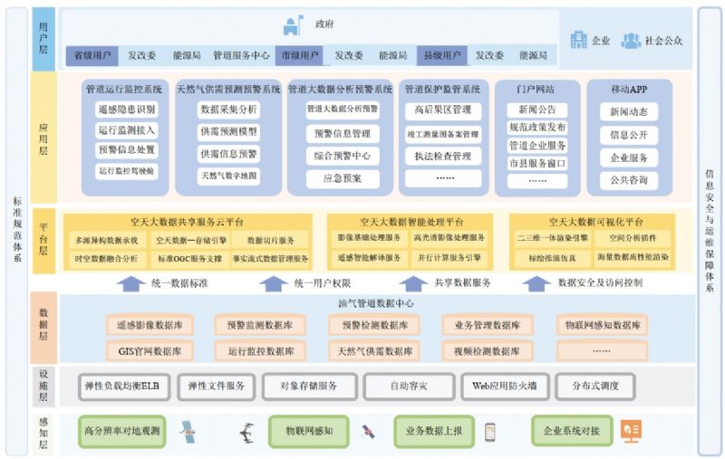 圍繞管道保護和資源保障監督管理等環(huán)節,集數據存儲、數據融合、遙感解譯、智能分析、綜合預警等功能于一體,匯聚了企業(yè)多源數據及遙感影像解譯等技術(shù),開(kāi)發(fā)了包括油氣管道運行監控、天然氣供需預警管理和大數據分析預警、管道保護監管等應用系統,以及門(mén)戶(hù)網(wǎng)站、手機移動(dòng)端等內容。