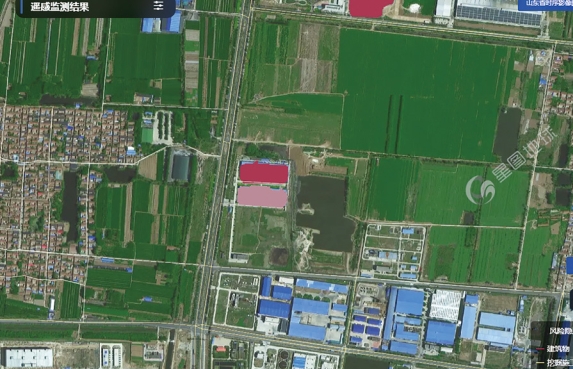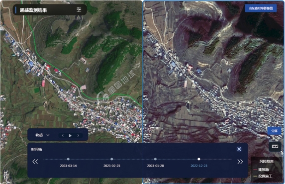 接入全省亞米級衛星遙感影像數據,每月開(kāi)展一次覆蓋全省范圍的遙感影像數據解譯工作,通過(guò)遙感解譯識別技術(shù)提取變化圖斑,監測中心線(xiàn)兩側5~200米范圍內地形地貌變化情況。利用目標檢測模型對隱患區域檢測識別建構筑物占壓、挖掘施工作業(yè)等隱患。以圖斑疊加于管道數據底圖的形式顯示管道周邊占壓、第三方施工等安全隱患情況,服務(wù)于管道風(fēng)險隱患識別、高后果區認定等業(yè)務(wù)。圖 2紅色圖斑為中心線(xiàn)兩側5~200米范圍內解譯識別出來(lái)的建筑物占壓。圖 3所示為不同期影像分屏對比,將當期解譯影像與往期影像結合,查看建筑物占壓歷史變化情況,提升了管道排查的效率和準確性。