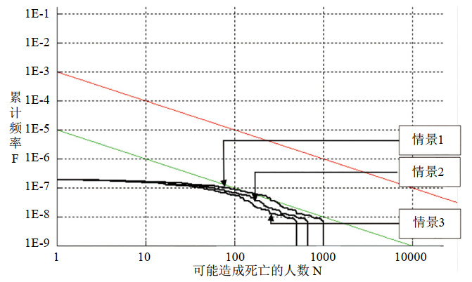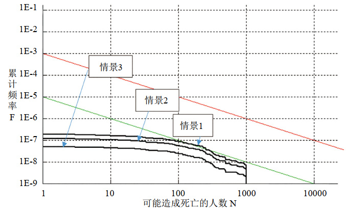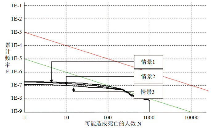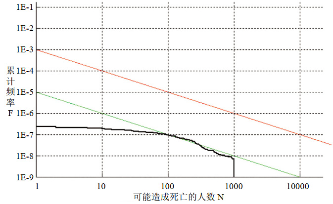 圖 2中紅線(xiàn)與綠線(xiàn)之間的區域表示可能造成死亡人數小于1000的區域為風(fēng)險可接受區。紅線(xiàn)之上以及可能造成死亡人數大于1000的區域為不可接受區。綠線(xiàn)之下以及可能造成死亡的人數小于1000的區域為風(fēng)險可接受區。