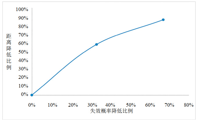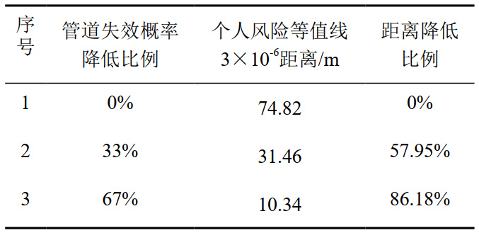 由表 2中數據結果可以看出降低失效概率可以有效降低個(gè)人風(fēng)險和社會(huì )風(fēng)險,見(jiàn)表 1、圖 3。當失效概率減小為原來(lái)的67%時(shí),3×10-6個(gè)人風(fēng)險等值線(xiàn)距離管道的距離降低了57.95%;當失效概率減小為原來(lái)的33%時(shí),3×10-6個(gè)人風(fēng)險等值線(xiàn)距離管道的距離降低了86.18%。從圖4中可以看出失效概率與人風(fēng)險等值線(xiàn)距離管道的距離呈正相關(guān)性,個(gè)人風(fēng)險值與社會(huì )風(fēng)險結果對管道失效概率值的變化都較敏感。