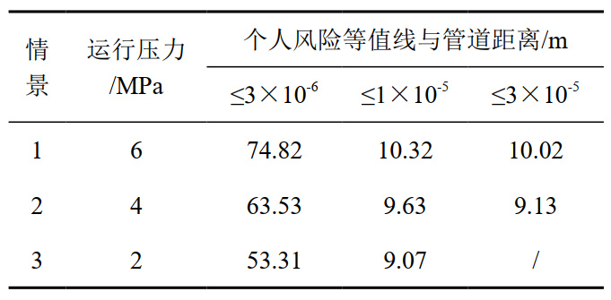 在假設其它條件不變的情況下,降低管道輸送壓力也會(huì )降低管道風(fēng)險。假設情景1為當前現狀,情景2為改變運行壓力為目前實(shí)際運行壓力的2/3,情景3為改變運行壓力為目前實(shí)際運行壓力的1/3。依次計算得到采取降壓措施導致個(gè)人風(fēng)險等值線(xiàn)與管道距離的關(guān)系,計算結果(表 3,圖 5)。