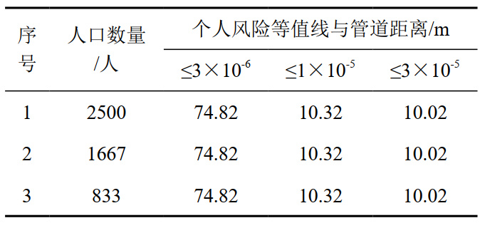 采取人口搬遷或管道改線(xiàn)措施,能使管道周?chē)丝跀盗拷档蛷亩_到降低管道風(fēng)險目的。情景1為現狀;情景2為假設其它條件不變,保持周邊人口區域位置不變,將周邊人口數量降為現有人口數量的2/3,一般采取改線(xiàn)或搬遷;情景3為假設其它條件不變,將周邊人口數量降為現有人口數量的1/3。依次計算得到采取措施后導致個(gè)人風(fēng)險等值線(xiàn)與管道距離的關(guān)系,計算結果(表 5)。