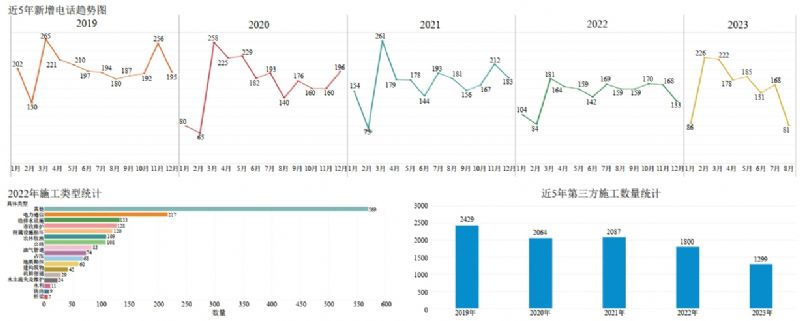 廣東大鵬液化天然氣有限公司所轄天然氣管道穿越經(jīng)濟發(fā)達的廣東珠三角地區,分別途經(jīng)惠州、深圳、東莞、廣州、佛山五個(gè)城市,管線(xiàn)長(cháng)度444千米。管道沿線(xiàn)每年有大量第三方施工活動(dòng),以2022年為例,全年共發(fā)現和處理管線(xiàn)周邊第三方施工活動(dòng)1791件,其中第三方施工活動(dòng)主要集中在電力通信、給排水設施、市政維護及農林牧漁等領(lǐng)域,高風(fēng)險作業(yè)主要集中在水利、鐵路、地鐵、路橋建設等項目(圖 1),具有數量大、種類(lèi)多、風(fēng)險高的特點(diǎn)。