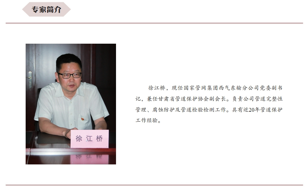 《管道保護》編輯部:西氣東輸是我國在新世紀之初開(kāi)工建設的一項世界級工程。作為這項工程的主要運營(yíng)單位,西氣東輸公司積極推行管道完整性管理,不斷提升企業(yè)管理水平,有力地保證了管道長(cháng)期安全運行,為維護國家能源安全和公共安全作出了突出貢獻。我們特別邀請西氣東輸公司黨委副書(shū)記徐江橋同志做客專(zhuān)家訪(fǎng)談欄目,介紹企業(yè)在完整性管理方面取得的一些成績(jì)和經(jīng)驗,與廣大讀者分享。郵箱:guandaobaohu@163.com。