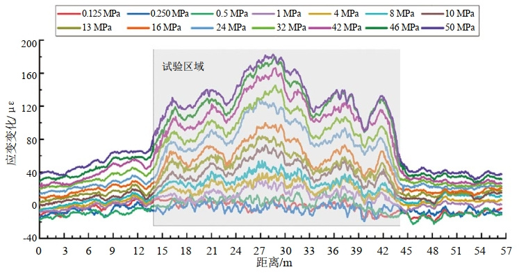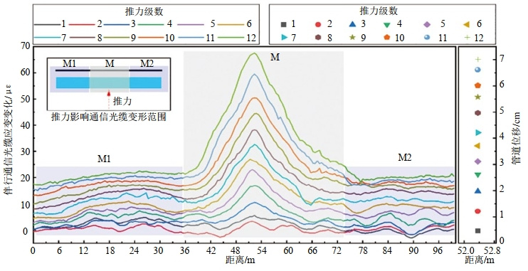 選擇一段廢棄的管道,開(kāi)展土體位移狀態(tài)下光纜變形與管道變形相關(guān)性原位試驗;驹囼炈悸肥,在近管道邊側開(kāi)挖作業(yè)坑,通過(guò)千斤頂水平方向給土體施加應力(模擬滑坡的作用力),推動(dòng)土體變形(模擬滑坡滑移變形),土體位移變形的過(guò)程中會(huì )帶動(dòng)管道及光纜受力變形,同步監測/檢測土體位移-管道應變-光纜應變(圖 5)。試驗最終得到管道的應變曲線(xiàn)(圖 6)和伴行光纜應變變化曲線(xiàn)(圖 7),分析兩者的應變關(guān)系,可以得到如下幾點(diǎn)認識:①土體位移/應力作用下管道和光纜均出現明顯的應變變化,應變變化的形態(tài)相似,呈現出以推力作用為中心,中心高往兩側逐漸降低的應變分布;②推力作用下,光纜和管道受力變形的范圍有放大效應,作用于土體推力的鋼板寬度為3.4 m,而在管道及光纜產(chǎn)生明顯的應變變化的長(cháng)度范圍約為30 m,相比于施加到土體上應力作用寬度擴大了約9倍,這是點(diǎn)應力在土體中呈扇狀擴散效應的結果;③在同一外力作用下,管道的變形(應變)量大于光纜的變形(應變)量,如最后一級推力下管道中間位置的最大應變值為300 με~350 με,相應的伴行通信光纜的應變值為180 με~200 με,后者約為前者的60%;④土體位移/應力作用下光纜應變響應出現的時(shí)間早于管道應變響應出現的時(shí)間,也就是說(shuō)光纜先于管道感知到外力的作用。