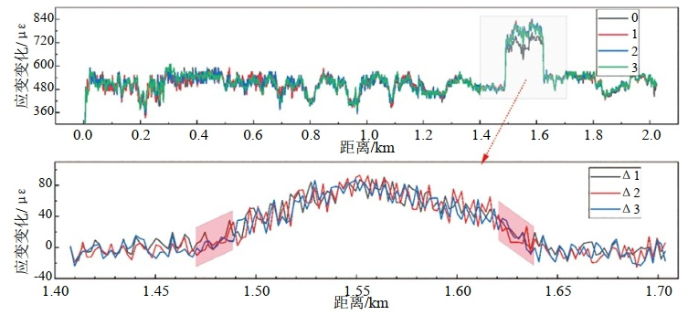 圖 8 羅針田滑坡段管道伴行光纜應變檢測曲線(xiàn)(上圖)及不同時(shí)段應變變化(下圖)