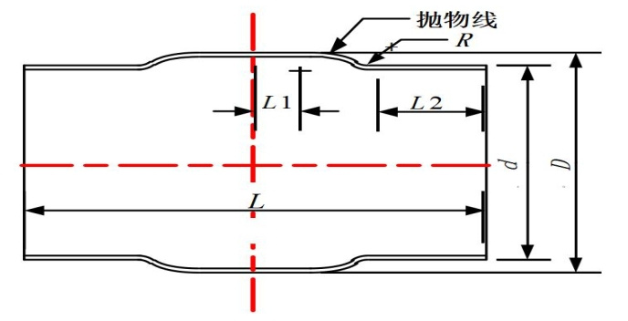 變徑段的曲線(xiàn)設計是本文研究的重點(diǎn)之一,根據曲線(xiàn)表達函數的不同,研究中將變徑段分為一次曲線(xiàn)型、二次曲線(xiàn)型和高次曲線(xiàn)型;谠撍悸,本研究設計了4種異型套筒構型:直線(xiàn)導角型、橢圓曲線(xiàn)型、拋物線(xiàn)型和Sigmond曲線(xiàn)型。以直線(xiàn)導角型異型套筒為例,套筒的截面形狀被定義為幾個(gè)不同的元素,即:直線(xiàn)段L1和L2;圓弧段R1和R2。每種異型套筒構型及關(guān)鍵尺寸等的詳細說(shuō)明見(jiàn)圖 1~圖 4。